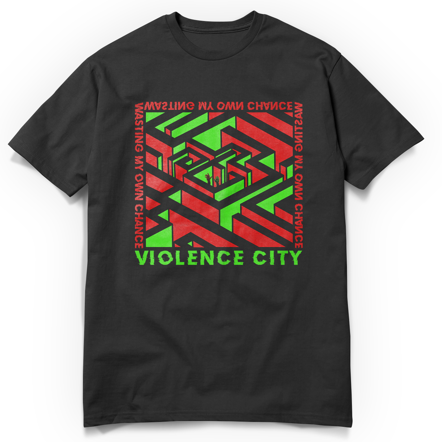 T-shirt noir inspiré du single « Wasting My Own Chance », avec un visuel de labyrinthe sur le devant. Le design symbolise les choix, les impasses et le fait de se perdre soi-même en cherchant la sortie, parfaitement lié à l’univers du morceau.